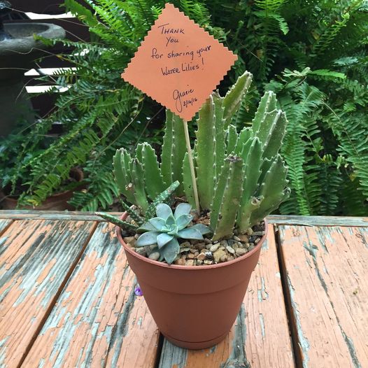 I told Gracie that I was preparing for the annual cleaning o’ the pond during which I would be thinning out the water lilies and asked her if she had a need for any. She said she most certainly would like to have some and so I arranged to leave a bucket of them on my driveway for her. Imagine my delight when I received this pot planted with a star cactus, an African aloe and a hens and chickens plant, all from her yard, with a sweet thank you note (I love that she dated it; I’m guessing she’s an accountant).