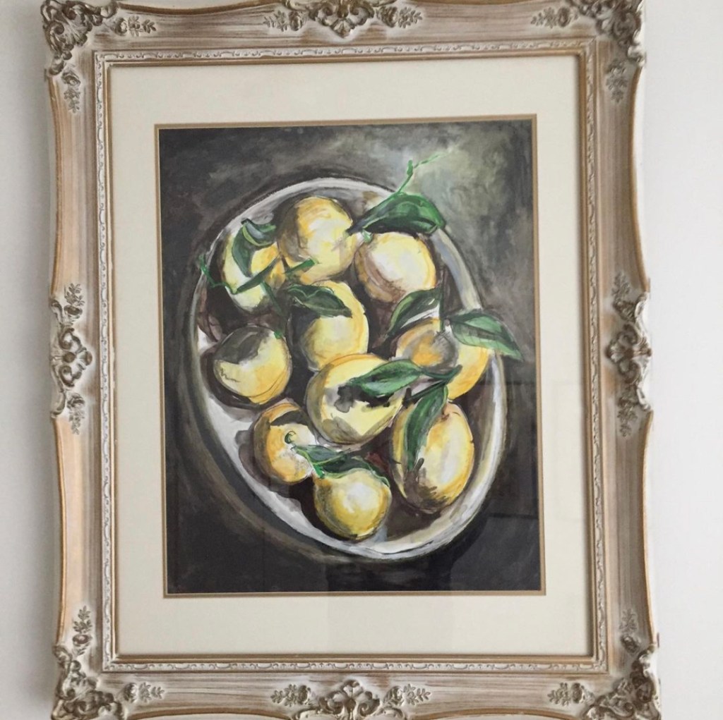 And lastly there’s the personal connection; working directly with an artist to create something that speaks to both you and them. Such is the case with my most recent addition. I had the pleasure of meeting Sarah Greene Reed at a party last year and we immediately hit it off. She has a background working in art galleries and is an accomplished artist herself http://sarahgreenereed.com/. As most of you who follow me know, I was pretty excited about my Meyer lemon tree this past year and posted photos of lemons like I had just given birth to them. And like a proud parent who feels that an Olan Mills portrait just isn’t enough, I decided I wanted them immortalized in pastels for me to gaze upon lovingly. Sarah has a strong background in painting and drawing florals, so while fruit was something of a logical extension of that, it was also a newfound challenge that she relished. And I relish the results. As Rod Stewart sang(sorta) nearly 50 years ago, “Every picture tells a story” and this one tells several; about me, about Sarah, about a very specific point in time, about lemons and lemonade. Its reach extends well beyond its frame.
