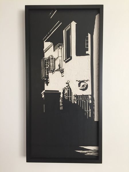 Here is a piece I recently purchased by Cuban artist Daniel Rodríguez Collazo. I visited Daniel’s studio when I was in Cuba though I acquired this through CAMIBAart Gallery here in Austin. The black and white contrast and the details are stunning, but that’s not even the half of it. This isn’t a painting per se, but a piece of drywall that has been painted solid black and the artist has then gone and cut out the images to reveal the gypsum. Knowing how the work is created is part of its story as much as the subject matter (interestingly, it’s untitled.)